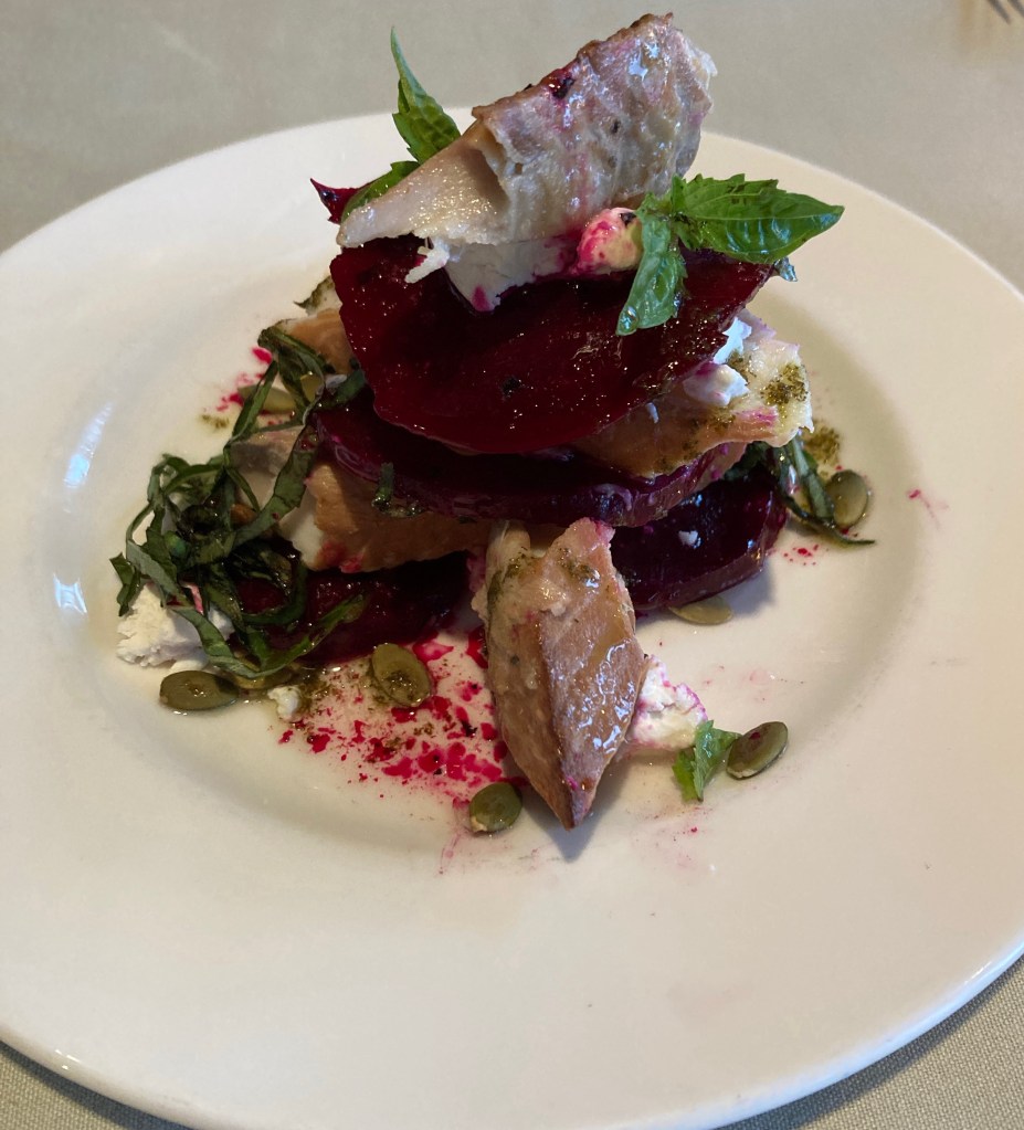 Saturday we drove back up north for our postponed anniversary lunch at The Oyster Bar, and it did not disappoint, bien sûr. After a few oysters we shared an entree of smoked sablefish (black cod) on marinated beet with pumpkin seeds. It reminded me that the reason I detested beets for most of my life was not the fault of God creating them, nor of the poor beet itself, it was just poor preparation. This was so good.