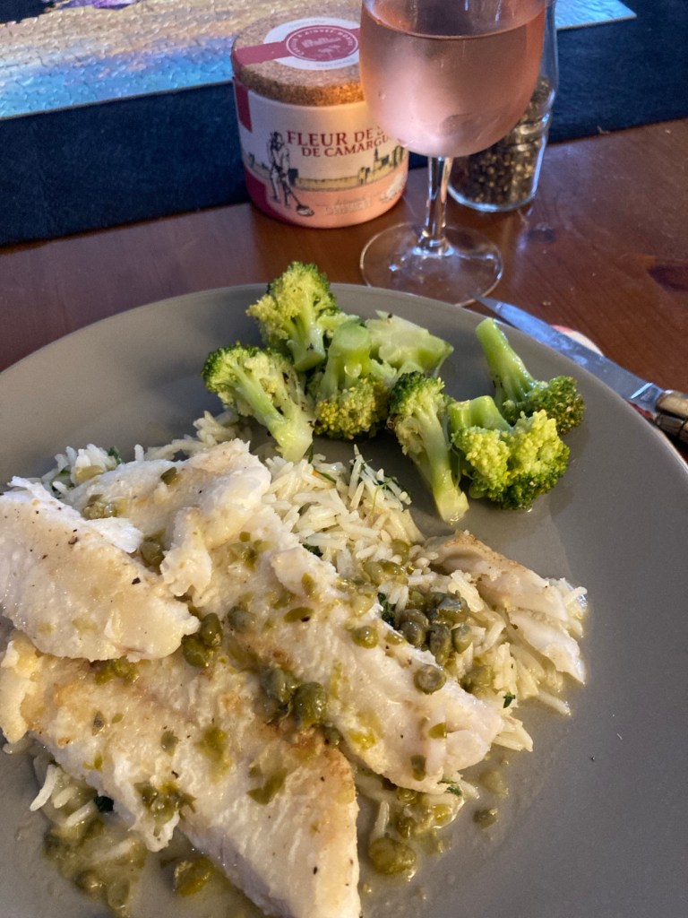 Tricia followed this with another of the comfort foods she does so well, sole meuniere. She has never posted the recipe but since it is a classic French dish you can certainly find it with an online search. It is one of those dishes that can seem intimidating, but there are simple versions. The caper sauce is what makes the dish, so rice pilaf was the perfect accompaniment.