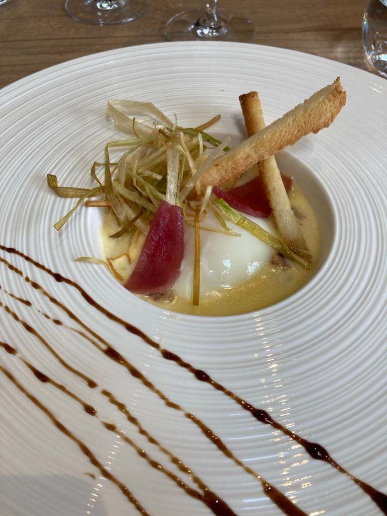 We have gone out to Le Bistrot St Julien, it remains our favorite in the area. We also went to Auberge de la Source, another of the places we like, in fact it seems we rarely go anyplace else. The entree, a basted egg in a camembert sauce with bits of andoulette, was stunning.