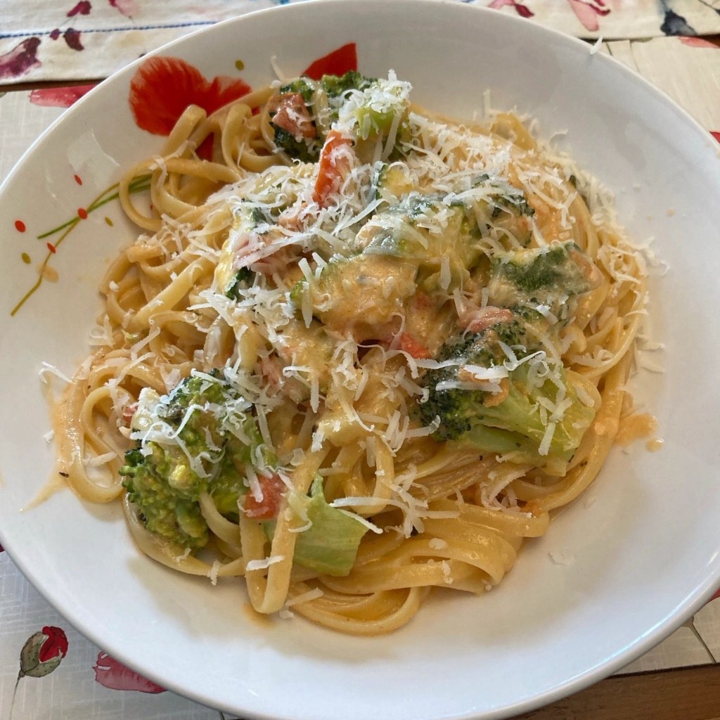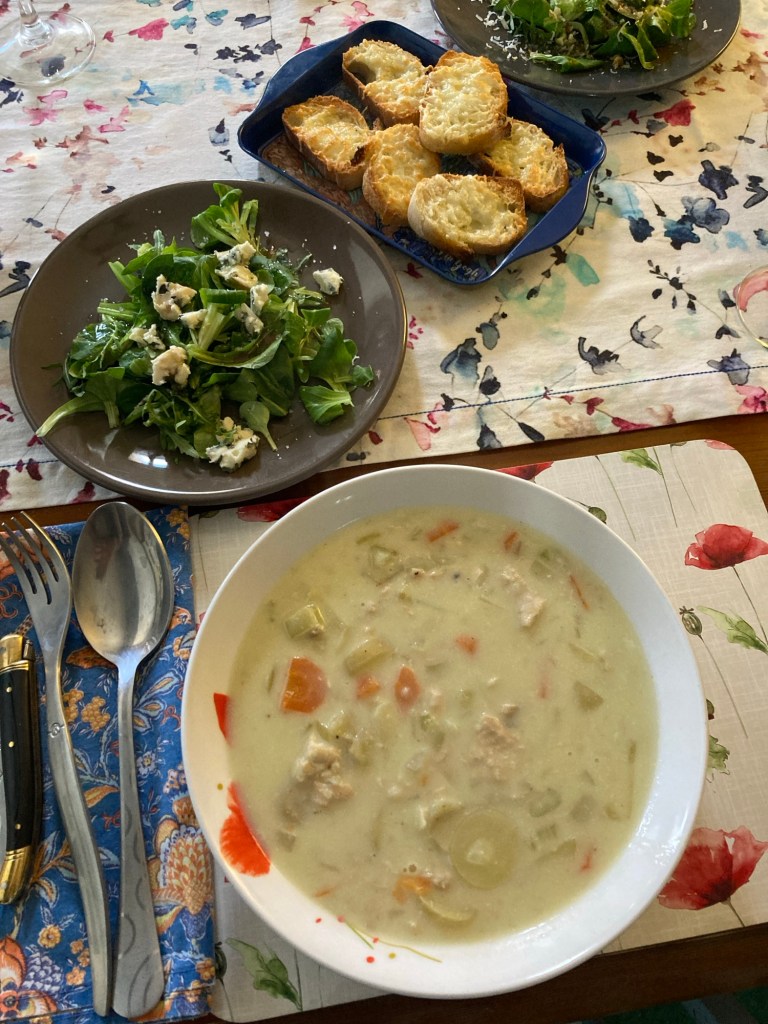 Started my day a bit off, but then, on the way to the Intermarché, Tricia reminded me that she was making pasta for lunch, it completely brightened my day; food is so important to us and our frame of mind. So now, thoroughly rejuvenated, I am writing while she is creating one of the best comfort foods in my life. I know we will be in Italy in eleven days – after stops in Paris, Lyon, and Geneva – yet her pasta is what has my attention today.