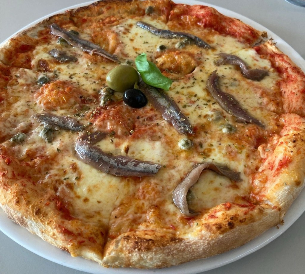 The food on the ship is quite good, but the cruise is arranged so that we arrive in port in time to find evening meals on our own, I had an anchovy pizza – I don’t tire of pizza.