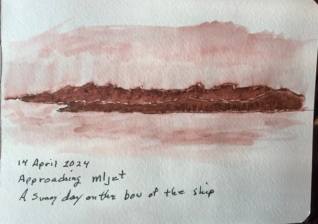 We made a stop at Mljet to hike through a National Park to a lake where we took a ferry to the tiny St Mary’s island and monastery. We never expected to get to do something like this but are so glad that it was part of the trip. I sketched this with brown ink as we were approaching the island.