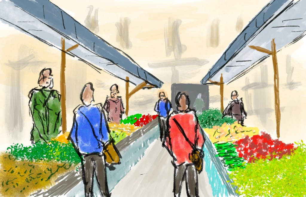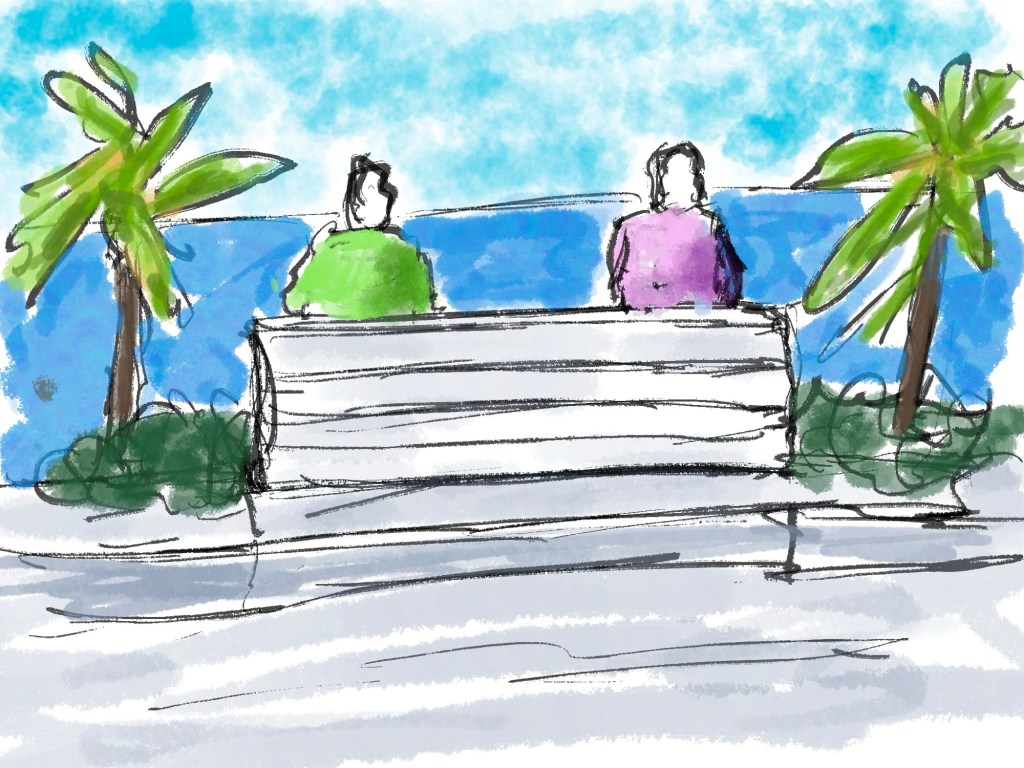 We are spending three weeks in Nanterre, a suburb of Paris. We came here to sell our car, which only took one day. This is not a place tourists come to, so we are interacting with France in a different way. Our one bedroom apartment has a nice outside area, just across from une pharmacie which you can see in this sketch I did on the deck.