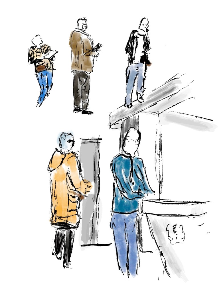 Wednesday we took a bus to the La Défense station where we caught a Metro into Paris for Tricia’s appointment with the eye doctor. I sketched people while I waited.