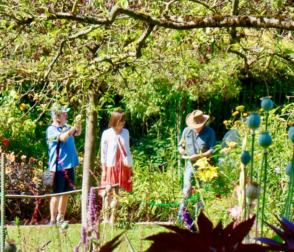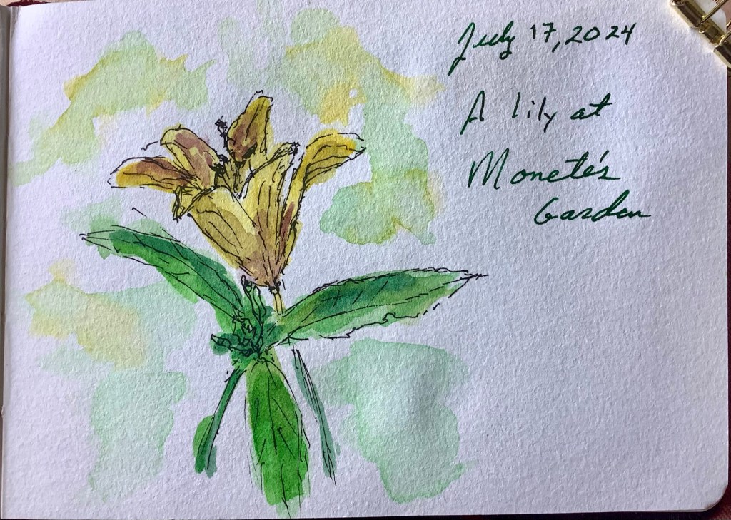 Today we had tickets to visit Monet’s garden. We were here 24 years ago with our daughter Alexis, Tricia’s sister and nieces. There were no tickets, and few other people. Today, what a change. It was like Disneyland on a busy day, the idyllic sensation was nowhere to be found. Yet I did a couple of sketches and even attracted some attention. Thank you Tricia for the photo.