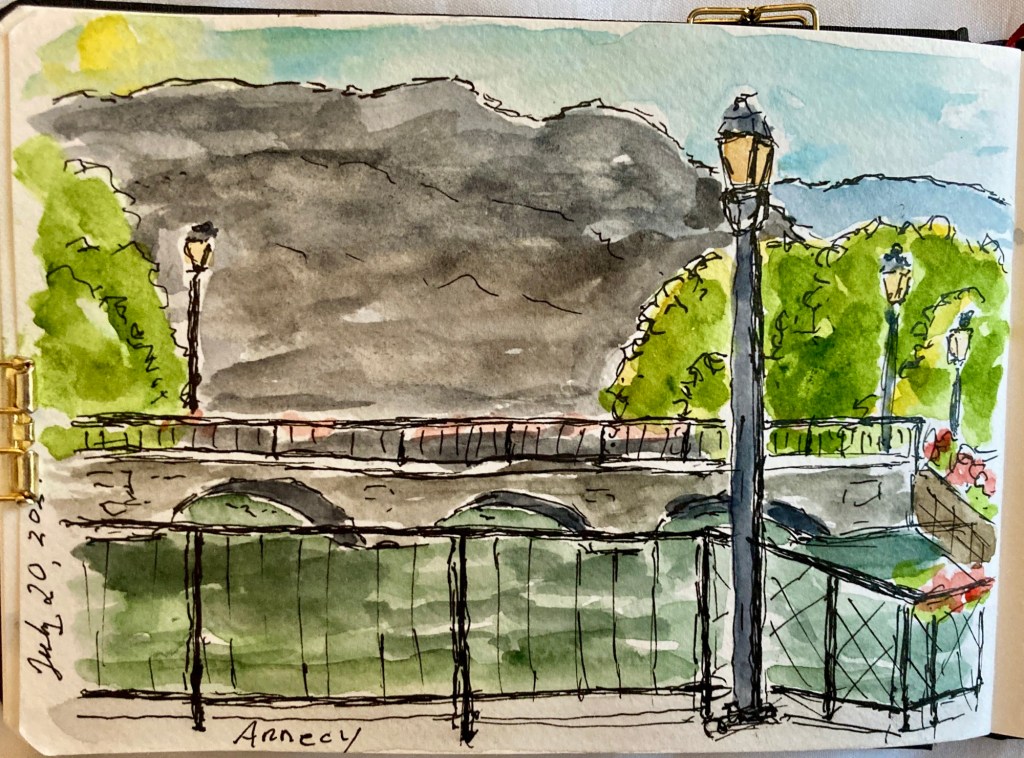 The Southeast part of France has its own unique charm and beauty. Annecy looks like a lovely place–and what fun and vibrant sketches–like the one of someone relaxing while watching hats sell at the market. Your sketches just add to our LOVE for France. We look forward to Christopherson photos and sketches of shutters–(which would make a beautiful book). The photo of that tartilette (?) made my mouth water. Slightly different reaction to other photo: you and your love for steak tartare!!!!