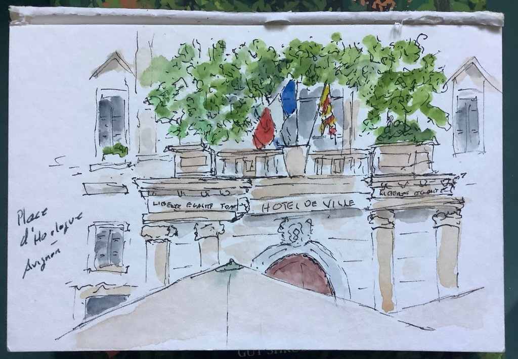Yesterday at La Cave Des Pas Sages I talked with a retired art professor from Paris who now lives in Avignon. He was painting in watercolor which is what motivated me to start up a conversation, he spoke little English, but we were able to have a nice conversation, I even understood a bit of it. I do hope we have the chance to talk again. Here are a couple of his paintings – quite impressive.