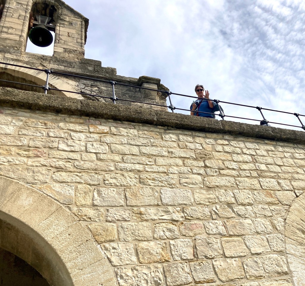 Wednesday we went to Pont d’Avignon, the Roman bridge famous in the children’s song. I climbed down the stairs for a photo of the first chapel, Tricia gave me a pontifical wave from above.