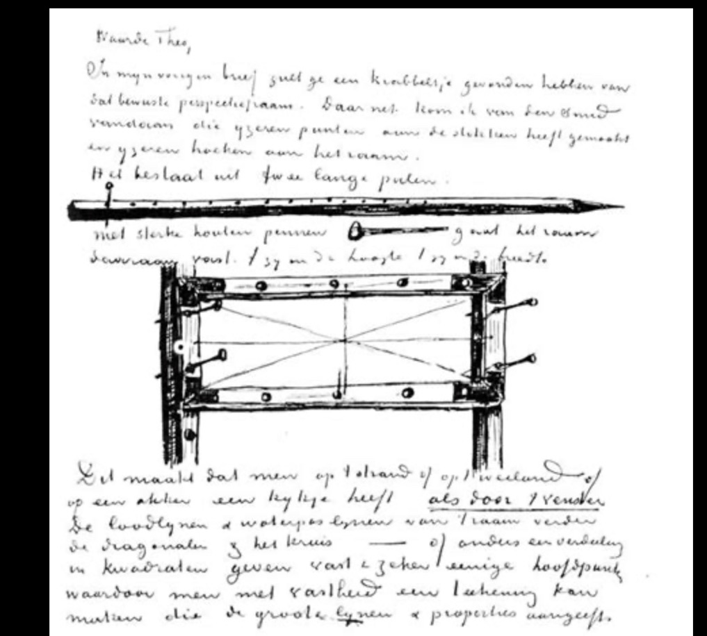 Here is a sketch that Van Gogh made of the large wooden grid he would carry with him into the field. He drove the stakes into the ground, then viewed his scene through the grid. His is specifically designed to help with perspective.