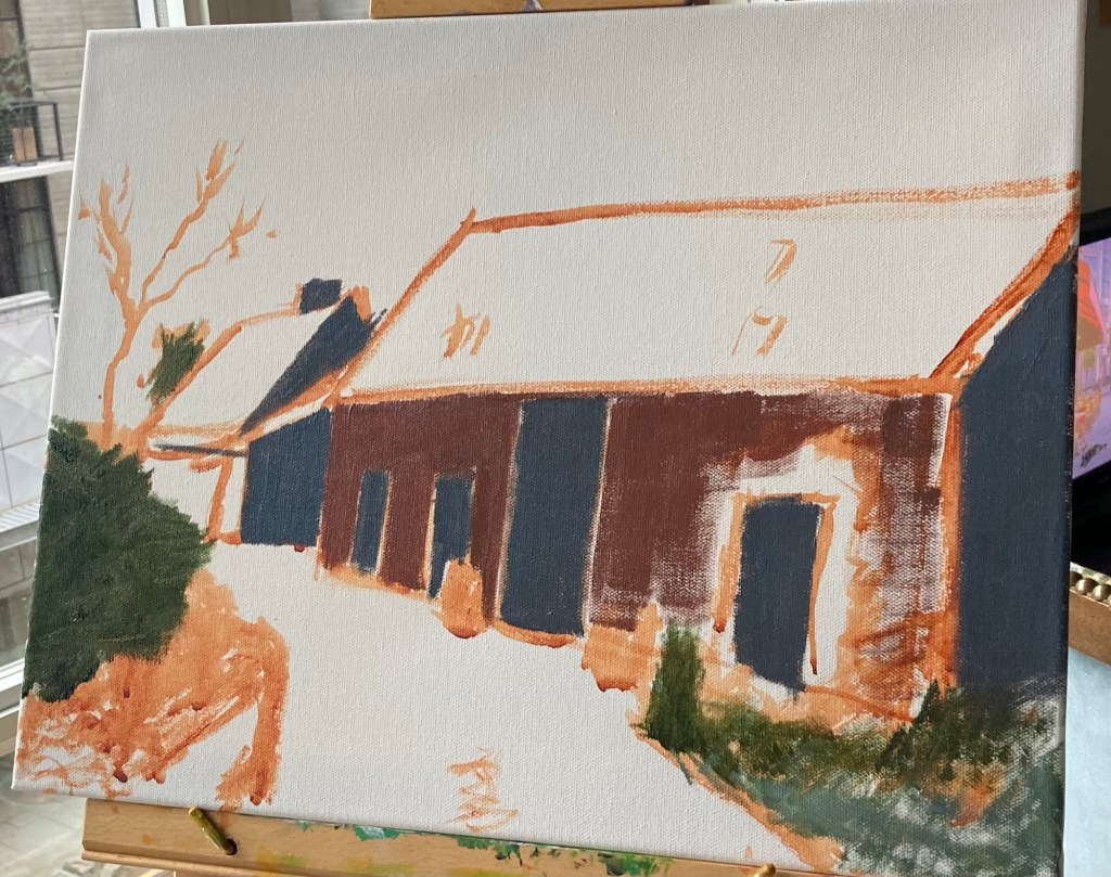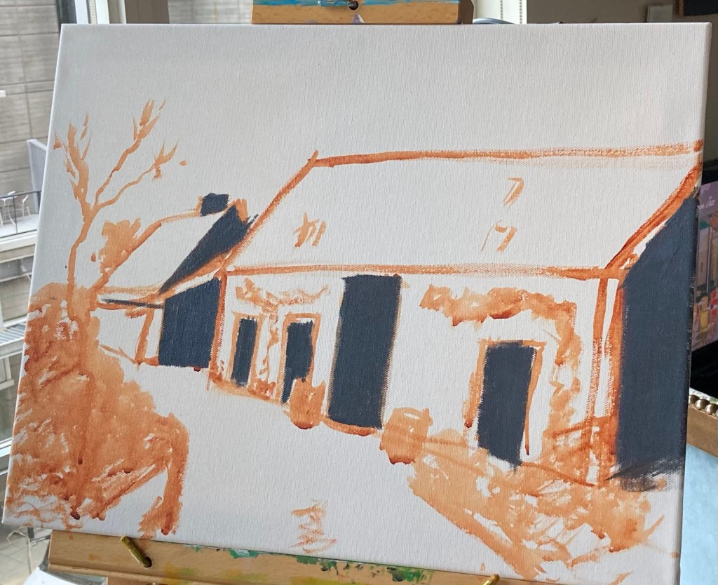 I started with a sketch using acrylic burnt sienna then after it dried I started blocking in the big shapes with oil paint – the darkest areas first.