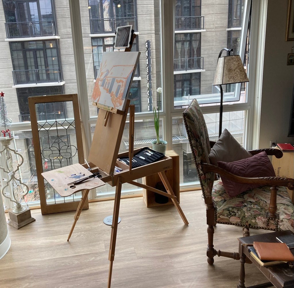 My painting set-up has temporarily taken over a bit of the living room area for the sake of good light.