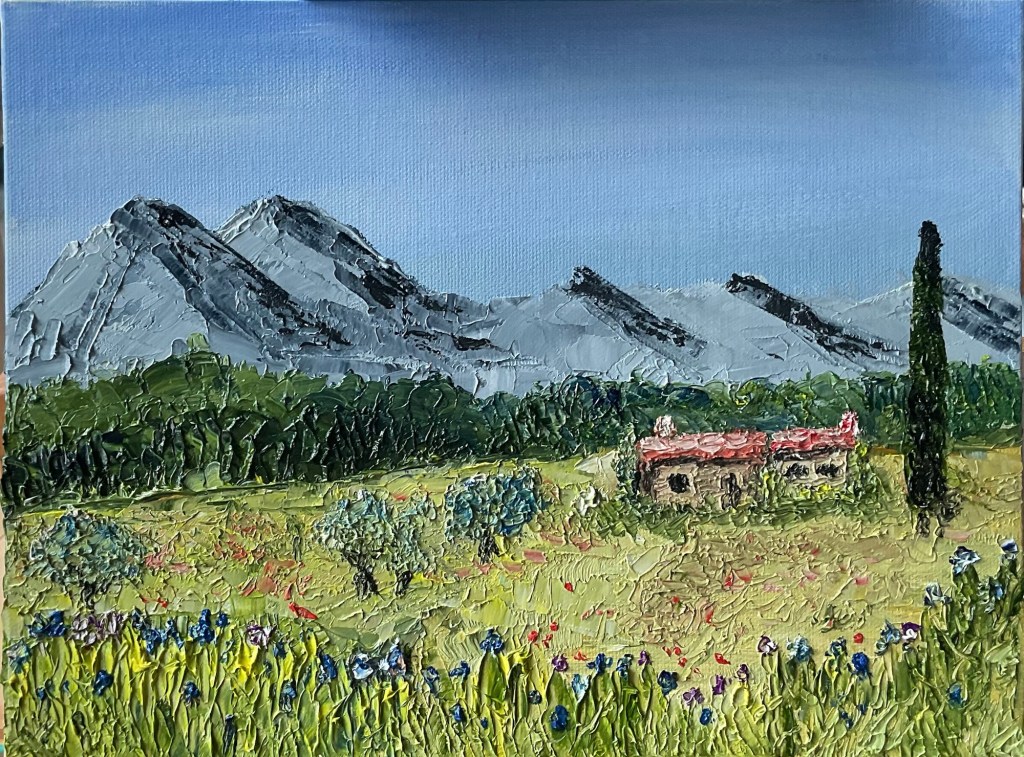 It captures a lot of what I like about Provence, the old buildings, cypress trees, and of course the national flower of France, the iris. When we return to Portland I will be posting more paintings for sale, this one will be included.