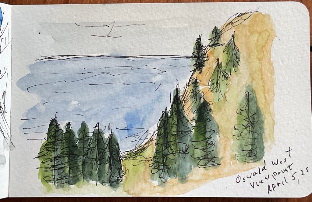Often I remind myself and other travelsketchers to do quick sketches when you travel. The goal is to capture the moment. This sketch captured the windy but sunny time we stopped at the Oswald West Viewpoint, on Neahkahnie Mountain. Tricia took photos, I quickly captured the moment in my pocket sketchpad, then added the color at home.