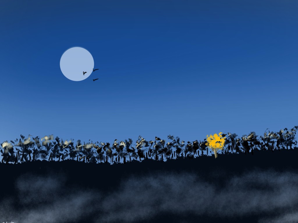 I did this painting inspired by a line from The Starless Sea by Erin Morgenstern: “Another is a bare forest by moonlight but a single tree is alive with golden leaves.” Loving this book, Alexis, our daughter, says it is one of her favorite books ever.