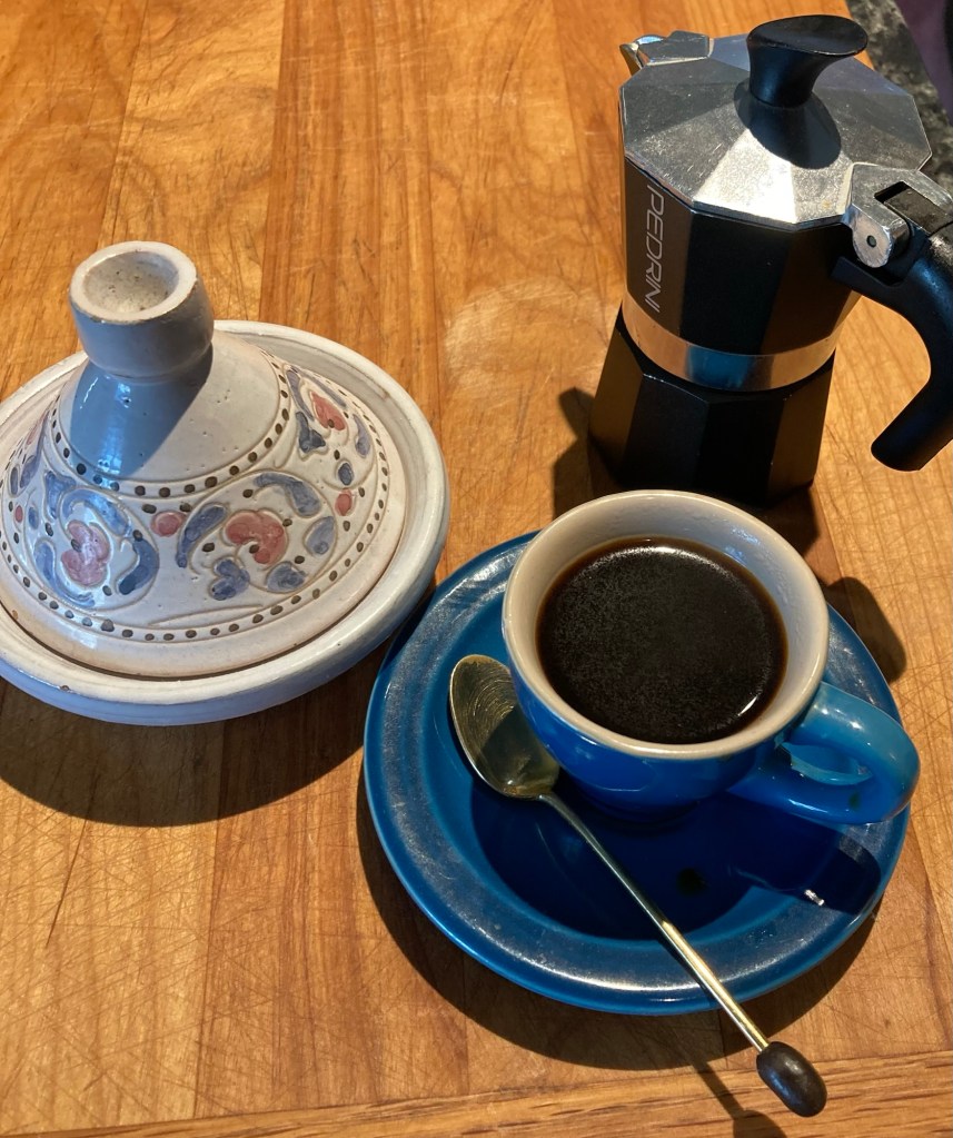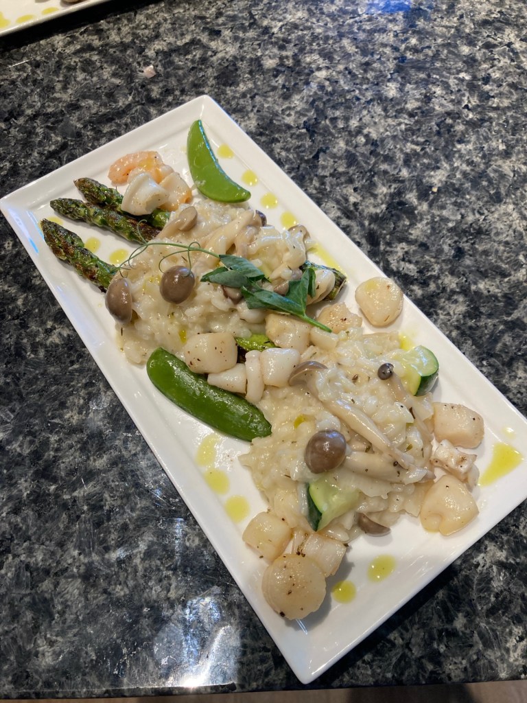 Tricia makes risotto that would do well at any risotto cook-off, yes they do have them. Her’s beats the majority of the offerings I get at restaurants, even from culinary trained chefs. This week it was mixed seafood with peas and asparagus. I finished the meal with un café.