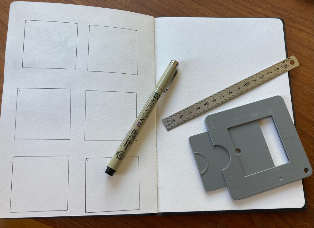 Begin by setting up a page in your book before you go. I drew the squares by tracing around my viewfinder, but an old credit card would work just as well. Each square will be a different moment or place.