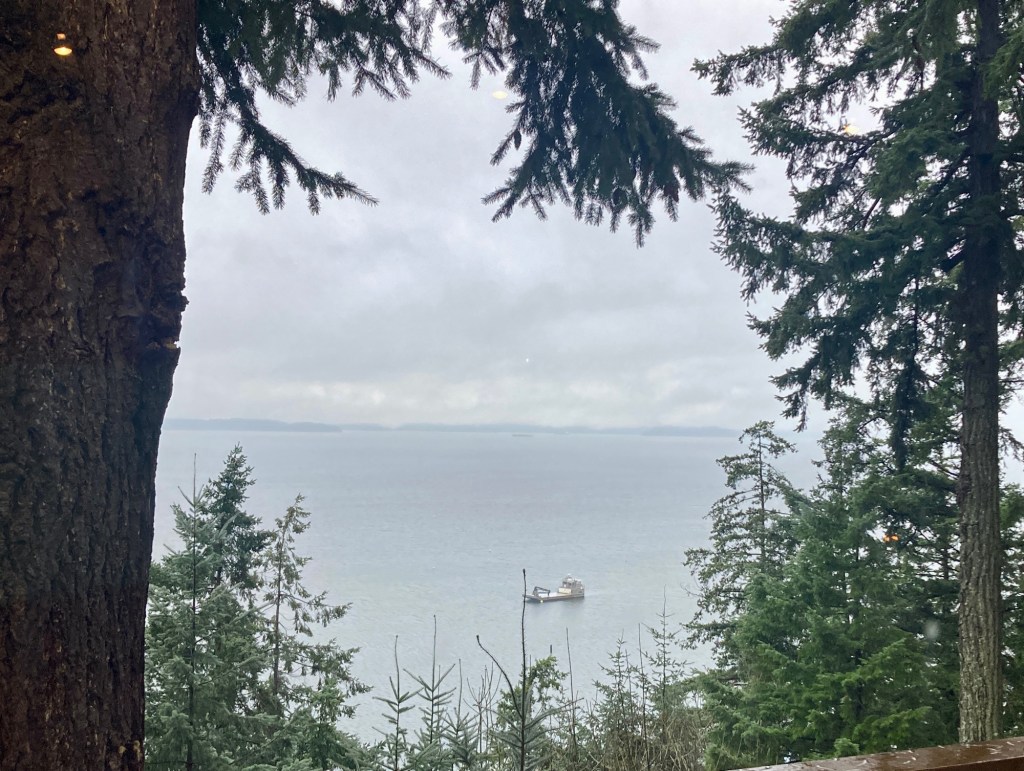 The restaurant sits on the edge of the steep slope above the Taylor Shellfish Farms and Samish Bay. On a clear day you can see San Juan Island in the distance. We always get the same table by the window which makes it easy to see the eagles that are almost always nearby.
