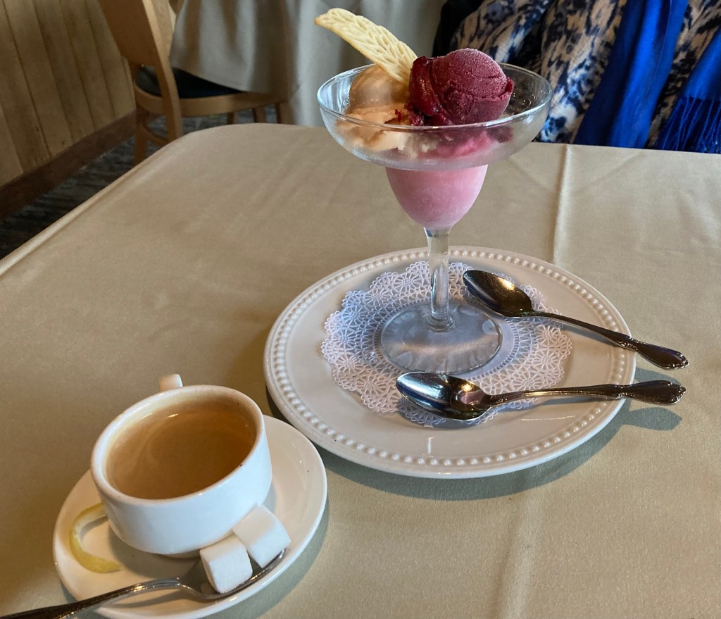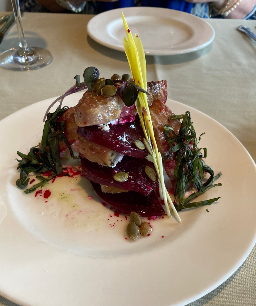 Then for our entrée we had the special of the day – smoked ling cod with roasted beet, goat cheese, and pumpkin seeds. It was so good that Tricia plans to create her own version this week using smoked trout.