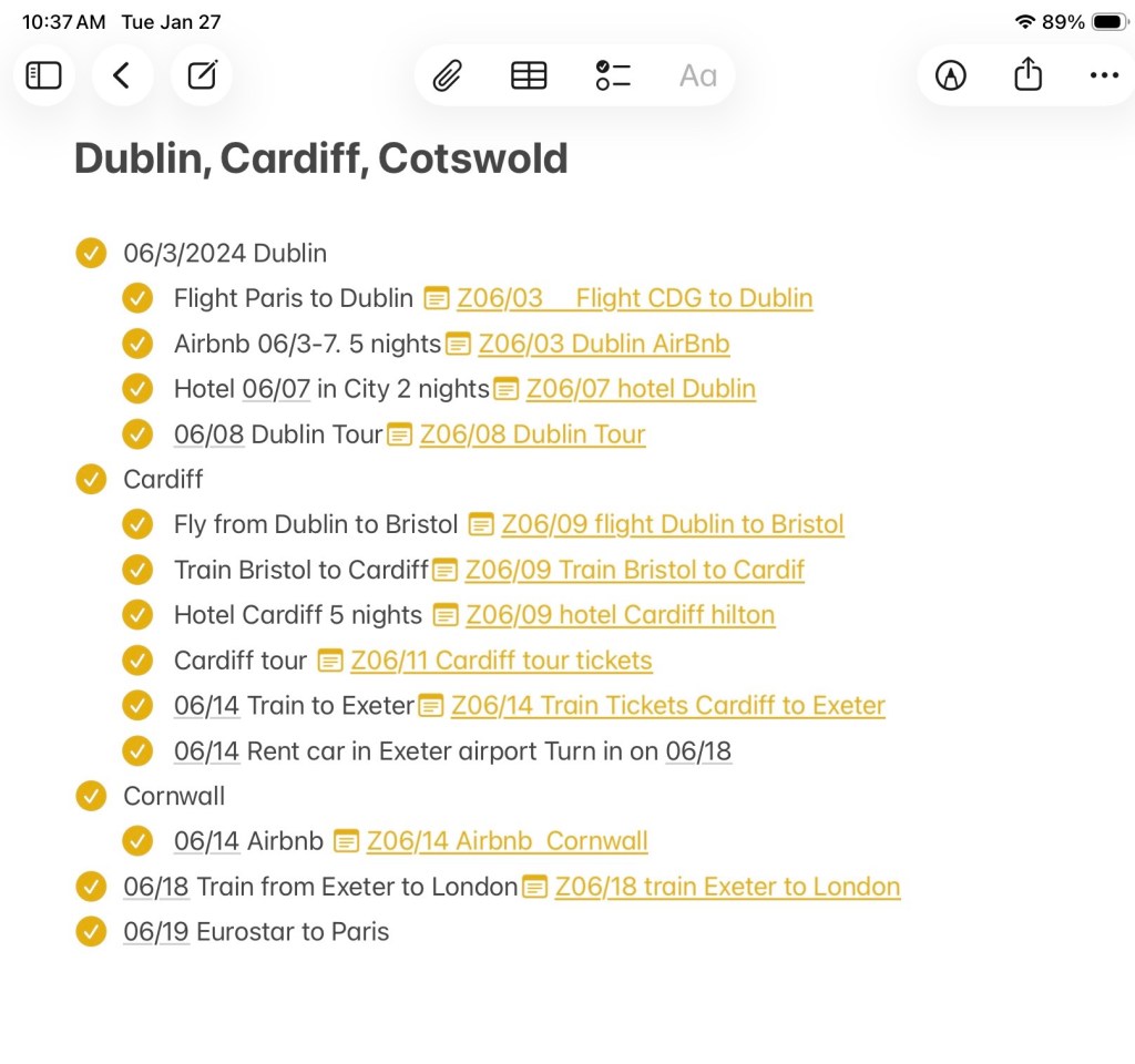 Very organised. I do like your planning and your past trip Dublin, Cardiff etc looks like an interesting adventure. I use the notes section for my holiday packing list. If I’m going on a similar trip to one before I find it useful to refer back rather than to start from scratch with what I’ll need to take.