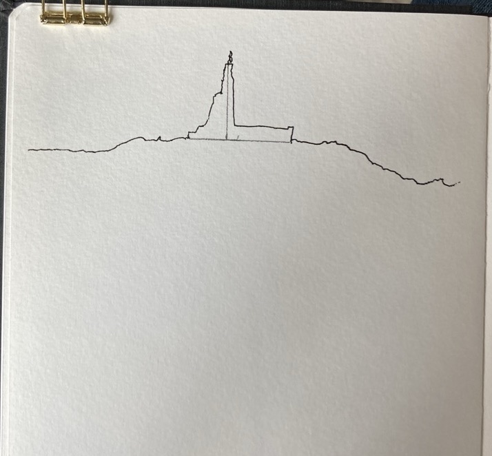 Next I used waterproof ink to draw the skyline, just one continuous line with no detail – an 02 or 03 Micron, a fountain pen, or a black ballpoint would do just fine. Don’t worry about every detail, just a general shape, and just leave the pencil lines in, they add character.