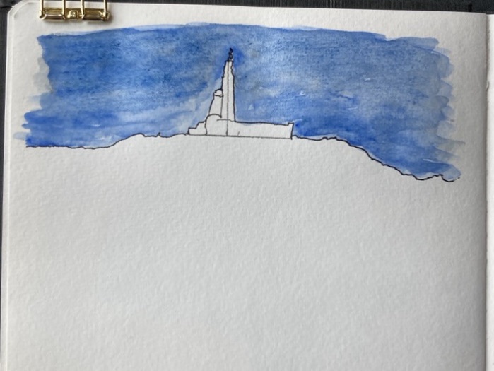 It is always a bit amazing how just the coloring of the sky makes the sketch stand out. To finish it off I used more Ultramarine Blue and it was done. Then you should add a few notes of the time and place. When you look back on this you will easily remember the time you were there, and it is really easy to do.