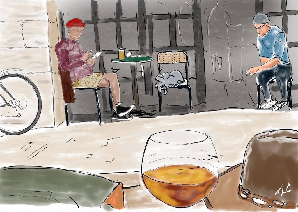 My first painting of the week was of my favorite place in Avignon, Le Cave des Pas Sages, along with a couple of the regulars.