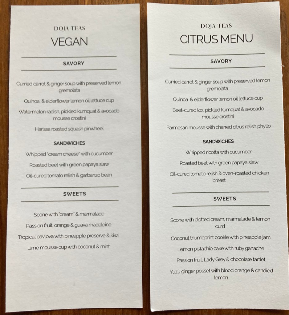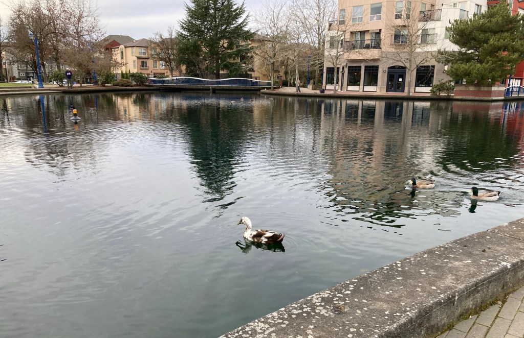 Tricia had the ‘Vegan’ – the rest of us carnivores had the ‘Citrus Menu’, though there was only a tiny bit of chicken on one item, the rest was vegetarian. Everything was great, Tricia and I did share a few bites of each other’s list. After a leisurely, almost two hours of tea, food, and laughter we walked around the lake to look at the ducks; you can see DOJA on the other side of the lake, near the bridge.