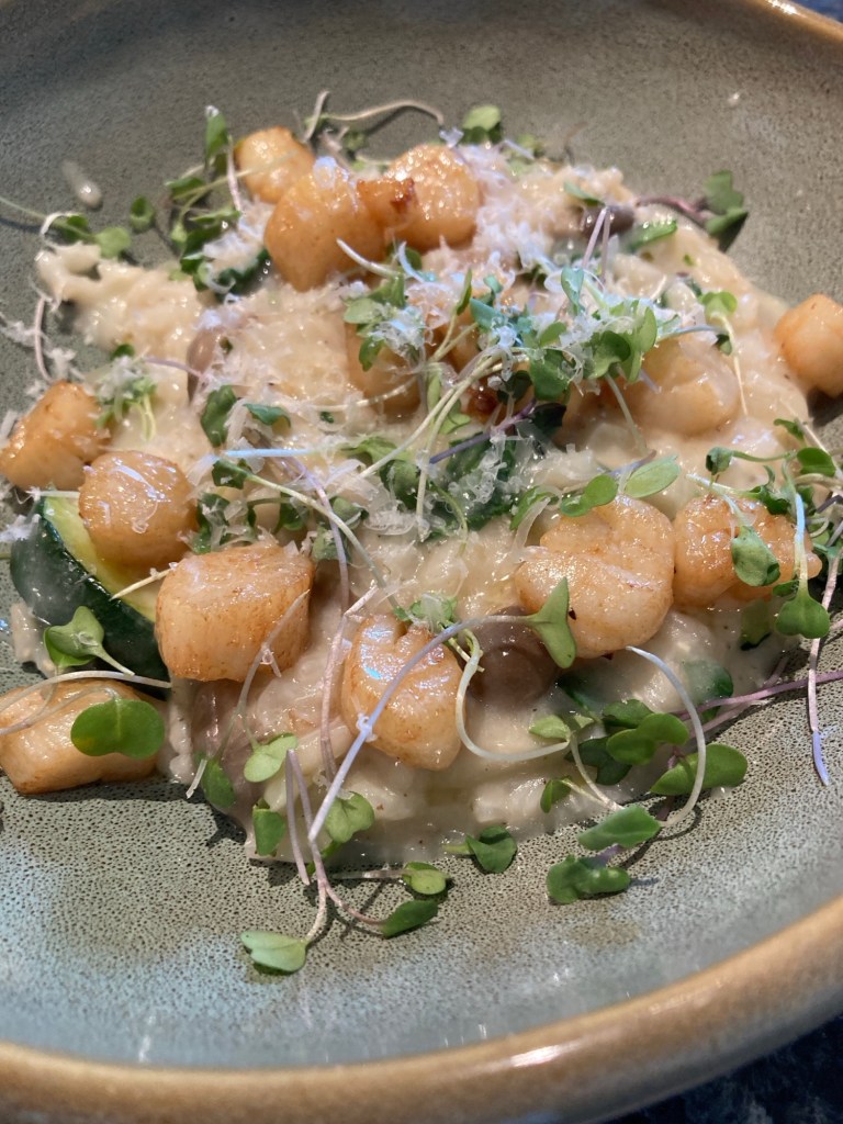 For Sunday lunch, Tricia made risotto with bay scallops, and small mushrooms. As always her risotto is better than most I have ever had, even at Michelin rated places – C’est la meilleure chef.