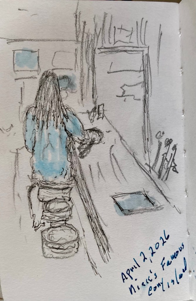 So it was a week of hope in the midst of a lot of angst, the pleasure we derive from cooking and eating good food, a bit of time with a friend, and lots of walks – a good week. I hope your week has gone well and that this coming week has some grande aventure et bon appétit. in it, even close to home. And of course I encourage you to capture some of it in a sketch.