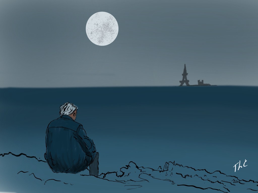 We of course are finishing-up our planning for Europe in just a month, so I was listening to a playlist of travel songs and Jimmy Buffett’s “A Frenchman for the Night” came up, triggering an idea for a painting.