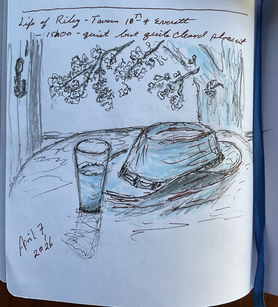 On Tuesday Tricia was at her bookclub, so I went exploring. There is a place not too far away called “The Life of Riley,” a bit of a dive bar that I have planned on checking out. The sun was shining, the trees have new leaves, a nice time for a graphite, ink, and marker sketch.